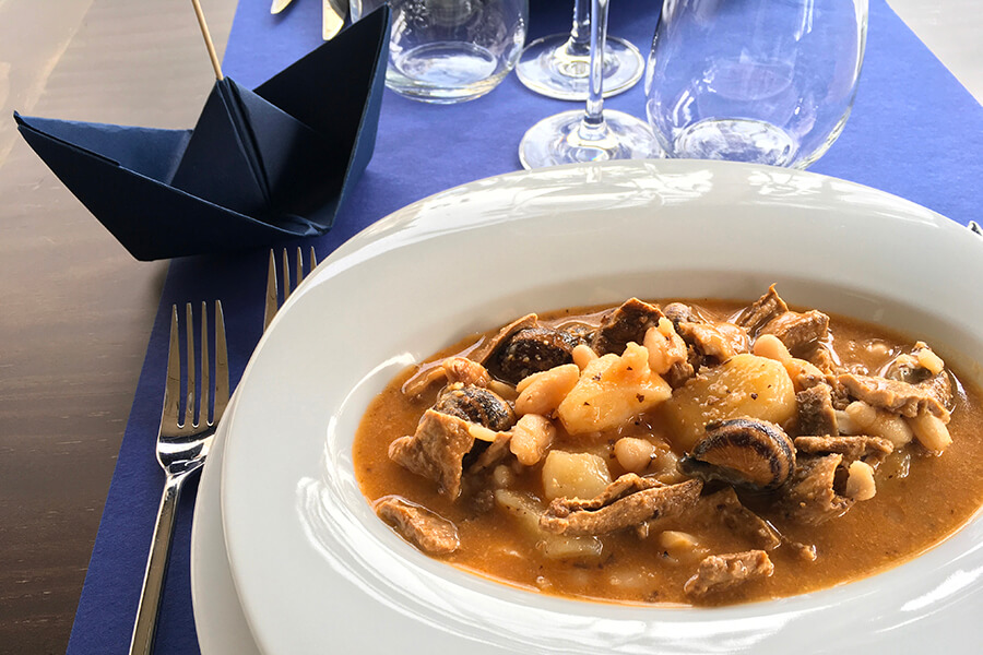 D’elaboració lenta, el sofregit és bàsic per a la degustació d’aquest plat. A base de nyores, ametlles torrades i alls, els artistes convidats són els cargols i la mongeta seca, acompanyats de patata.