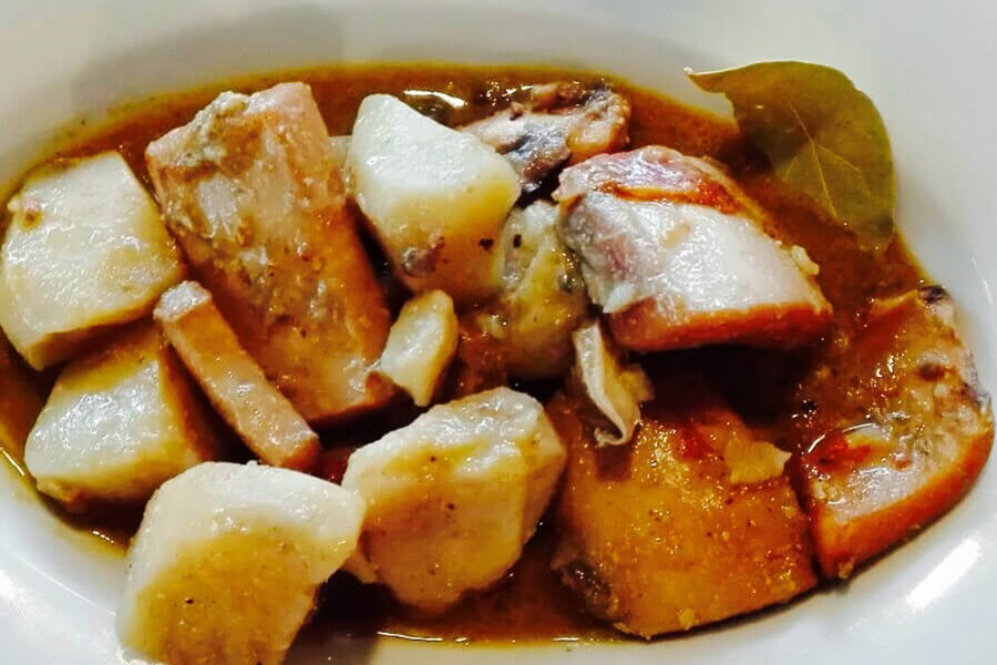 El plat d’hivern vilanoví més contundent. És un guisat de rebost, de les èpoques en que el temps no permetia anar en mar i els pescadors preparaven menges amb el que trobaven al rebost i aprofitant el “peix de terra” com el bacallà o la tonyina. En aquest cas aprofitaven l’estómac o el bull de la tonyina seca.